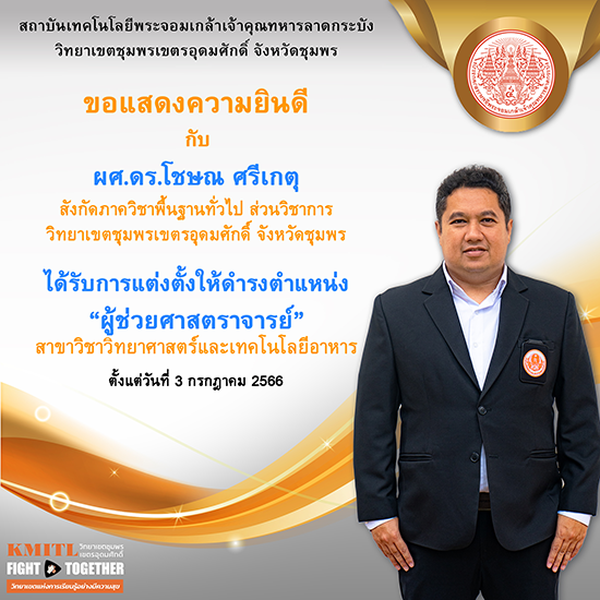 ได้รับการแต่งตั้งให้ดำรงตำแหน่ง "ผู้ช่วยศาสตราจารย์" สาขาวิชาวิทยาศาสตร์และเทคโนโลยีอาหาร