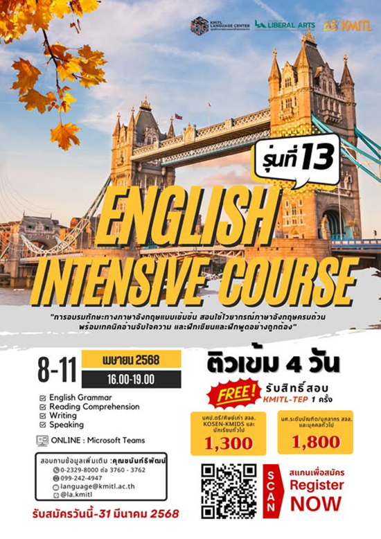 🚨 พิเศษ!! รับสิทธิ์สอบ KMITL-TEP ฟรี 1 ครั้ง และได้รับใบประกาศนียบัตร Certificate​ of Attendance เมื่อเข้าเรียนครบชั่วโมงตามที่กำหนด
