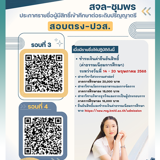 สจล-ชุมพร ประกาศรายชื่อผู้มีสิทธิ์เข้าศึกษาต่อ ปวส.เทียบโอน รอบที่ 3 และ 4