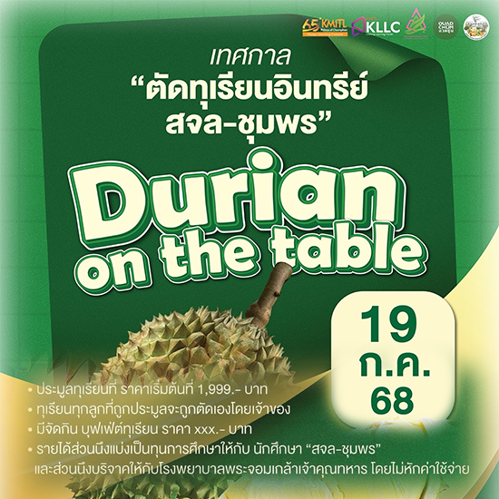 🥁 วันที่ 19 ก.ค. 2568 พบกับ เทศกาล “ตัดทุเรียนอินทรีย์ สจล-ชุมพร”และ Durian on the table🍃