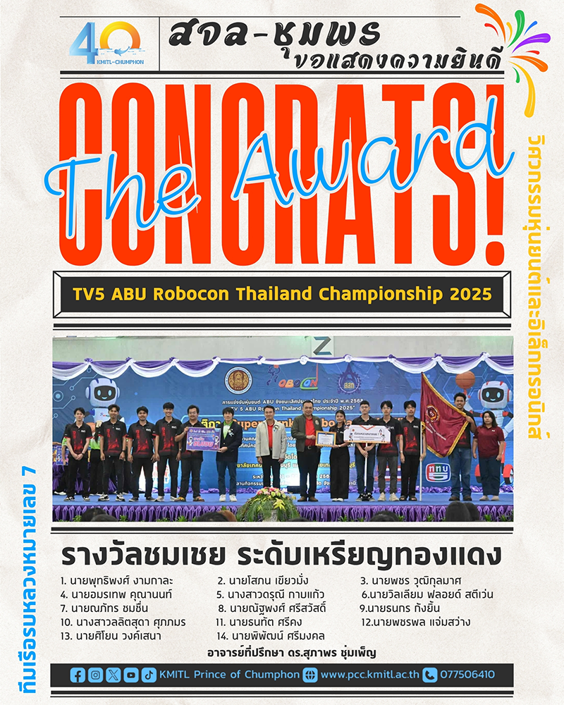 ขอแสดงความยินดีกับ "ทีมเรือรบหลวงหมายเลข 7" นักศึกษาจากหลักสูตรวิศวกรรมหุ่นยนต์และอิเล็กทรอนิกส์ ได้รับ "รางวัลชมเชย ระดับเหรียญทองแดง"