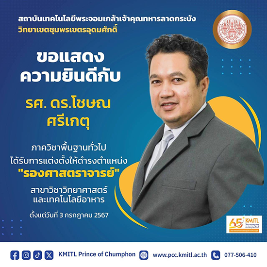 สจล-ชุมพร ขอแสดงความยินดีกับ รศ.ดร.โชษณ ศรีเกตุ สังกัดวิทยาเขตชุมพรเขตรอุดมศักดิ์
