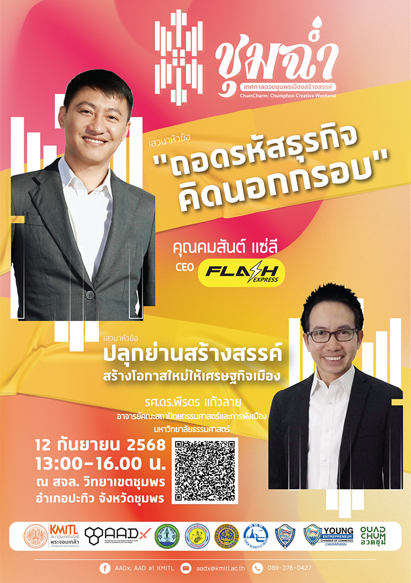 ขอเชิญชวนคนชุมพร และพื้นที่ใกล้เคียง ร่วมฟังเสวนาพิเศษ จัดโดย สจล., YEC ชุมพร, คาเฟ่อวดชุม โดย ยูนิคอร์นคนแรกของประเทศไทย 🚀 คุณคมสันต์ แซ่ลี, CEO- Flash Express 📍 วันศุกร์ที่ 12 กันยายน 2568 ณ สจล.วิทยาเขตชุมพร