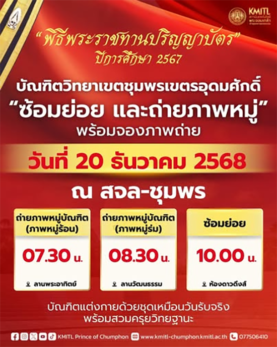 กำหนดการซ้อมย่อยและถ่ายภาพหมู่บัณฑิต สจล-ชุมพร ประจำปีการศึกษา 2567