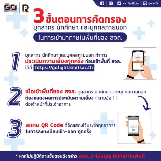 1.บุคลากรและนักศึกษา และบุคคลภายนอก ทำการประเมินความเสี่ยงทุกครั้งก่อนเข้าพื้นที่ สจล. ได้ที่ https://gofight.kmitl.ac.th (ทำการประเมินเพียงวันละ 1 ครั้ง)