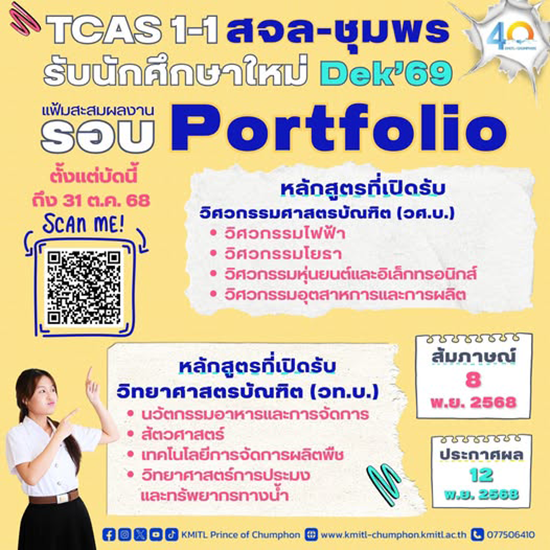 สจล-ชุมพร รับสมัครนักศึกษาใหม่ ระดับปริญญาตรี TCAS 1-1 Portfolio Read More »