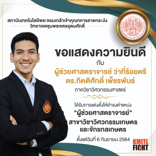 ได้รับการแต่งตั้งให้ดำรงตำแหน่ง “ผู้ช่วยศาสตราจารย์” สาขาวิชาวิศวกรรมเกษตรและจักรกลเกษตร
