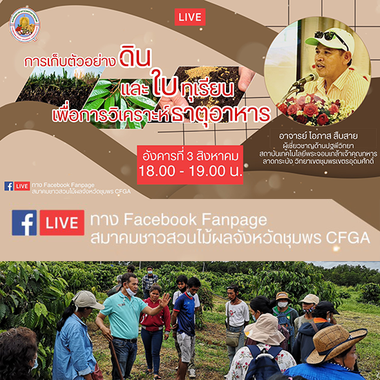 วันอังคาร ที่ 3 สิงหาคม 2564 Live สดการเก็บตัวอย่างดินและใบทุเรียนเพื่อการตรวจวิเคราะห์ธาตุอาหาร