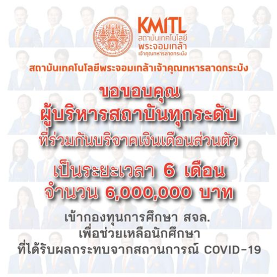 ผู้บริหารสถาบันทุกระดับบริจาคเงินส่วนตัว รวม 6 ล้านบาท ช่วยเหลือนักศึกษาที่ได้รับผลกระทบจาก COVID-19