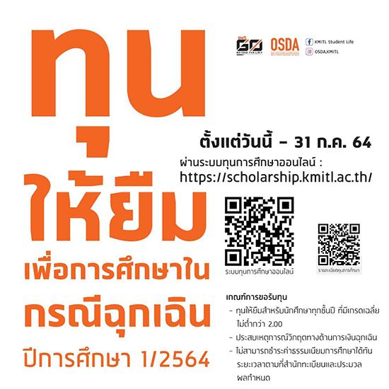 ทุนให้ยืมเพื่อการศึกษากรณีฉุกเฉินสำหรับนักศึกษาชั้นปีที่ 2 ชั้นปีที่ 3 และชั้นปีที่ 4 เป็นการให้นักศึกษายืมค่าเทอม 1/2564