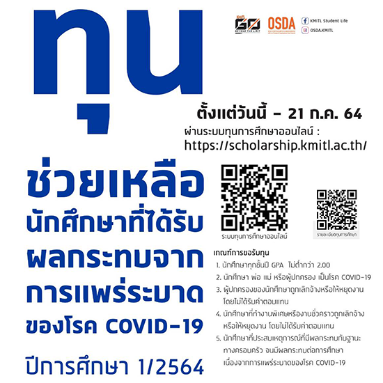 ทุนช่วยเหลือนักศึกษาที่ได้รับผลกระทบจากการแพร่ระบาด COVID-19 จำนวนเงินทุน 10,000 บาท