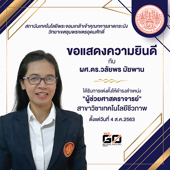 ผศ.ดร.วลัยพร มัฆพาน ได้รับการแต่งตั้งให้ดำรงตำแหน่ง “ผู้ช่วยศาสตราจารย์” สาขาวิชาเทคโนโลยีชีวภาพ ตั้งแต่วันที่ 4 สิงหาคม 2563