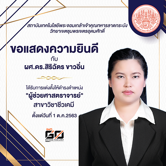 ผศ.ดร.สิริฉัตร ขาวอิ่น ได้รับการแต่งตั้งให้ดำรงตำแหน่ง “ผู้ช่วยศาสตราจารย์่” สาขาวิชาชีวเคมี ตั้งแต่วันที่ 1 ตุลาคม 2563