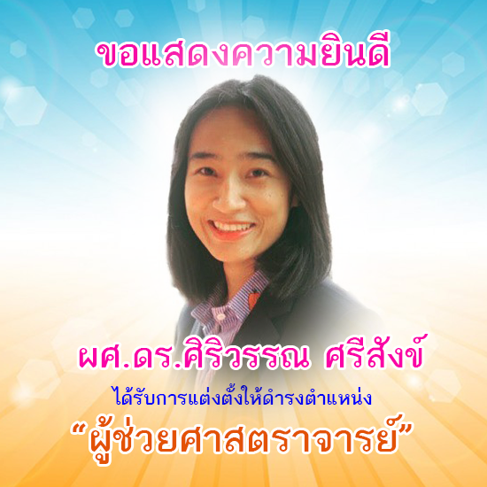 ขอแสดงความยินดี ผศ.ดร.ศิริวรรณ ศรีสังข์ ได้รับการแต่งตั้งให้ดำรงตำแหน่ง “ผู้ช่วยศาสตราจารย์”