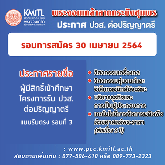 รายชื่อผู้มีสิทธิ์เข้าศึกษา โครงการรับ ปวส.ต่อปริญญาตรีแบบรับตรง รอบที่ 3 ประจำปีการศึกษา 2564
