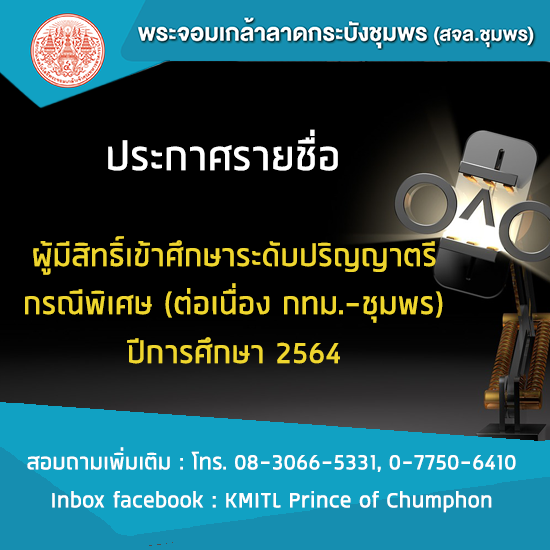ประกาศรายชื่อผู้มีสิทธิ์เข้าศึกษาระดับปริญญาตรี กรณีพิเศษ (ต่อเนื่อง กทม.-ชุมพร) วิทยาเขตชุมพรเขตรอุดมศักดิ์ จังหวัดชุมพร ประจำปีการศึกษา 2564