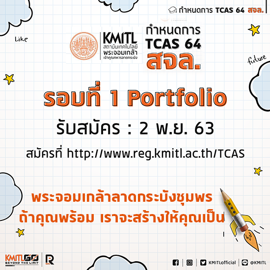 รับสมัคร TCAS64 สจล. วิทยาเขตชุมพรเขตรอุดมศักดิ์ รอบที่1 Portfolio เปิดรับสมัครวันที 2 พฤศจิกายน 2563 สมัครได้ที่ https://www1.reg.kmitl.ac.th/TCAS/tcas.php