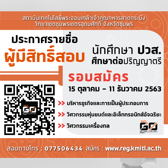 รายชื่อผู้มีสิทธิ์เข้าสอบ โครงการรับ ปวส. ต่อปริญญาตรี แบบรับตรง สจล.วิทยาเขตชุมพรเขตรอุดมศักดิ์ จังหวัดชุมพร