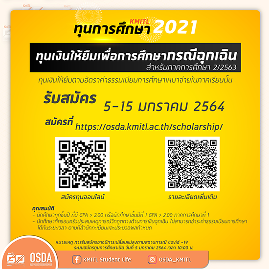 ทุนการศึกษา 2021 ทุนเงินให้ยืมเพื่อการศึกษากรณีฉุกเฉิน สำหรัภาคการศึกษา 2/2563