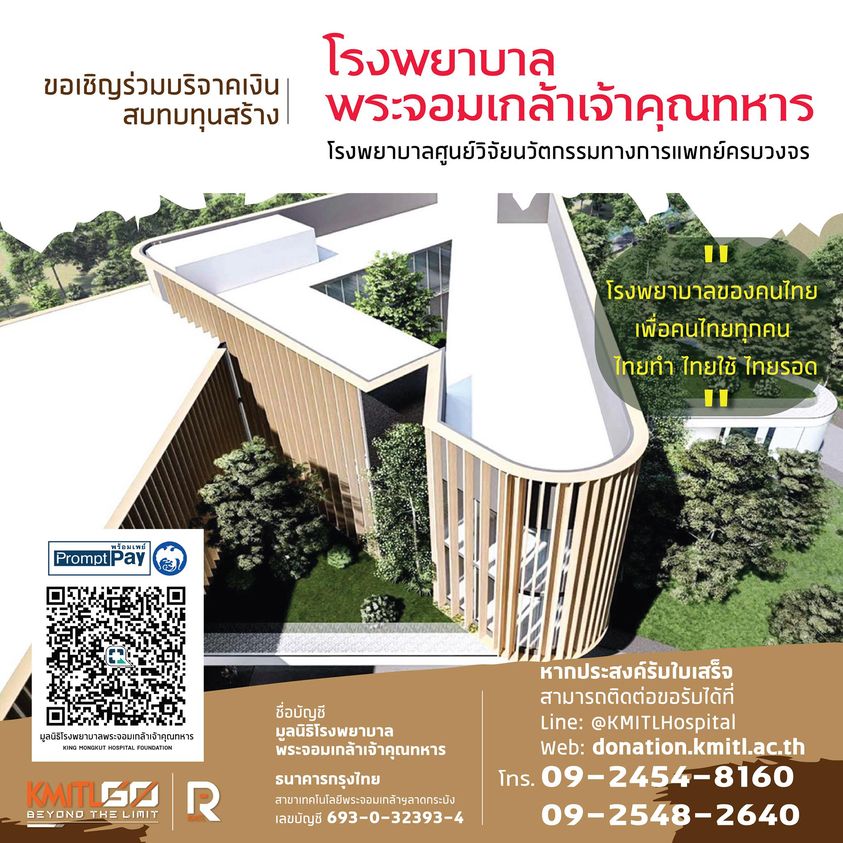 ขอเชิญร่วมบริจาคเงินสมทบทุนสร้าง โรงพยาบาลพระจอมเกล้าเจ้าคุณทหาร โรงพยาบาลศูนย์วิจัยนวัตกรรมทางการแพทย์ครบวงจร ใบเสร็จเงินบริจาคลดหย่อนภาษีได้ 100%