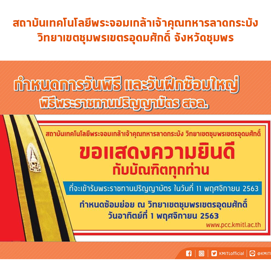 สถาบันเทคโนโลยีพระจอมเกล้าเจ้าคุณทหารลาดกระบัง วิทยาเขตชุมพรเขตรอุดมศักดิ์ ฝึกซ้อมย่อยงานพิธีพระราชทานปริญญาบัตร ประจำปีการศึกษา 2562 ณ บริเวณลานพระอาทิตย์